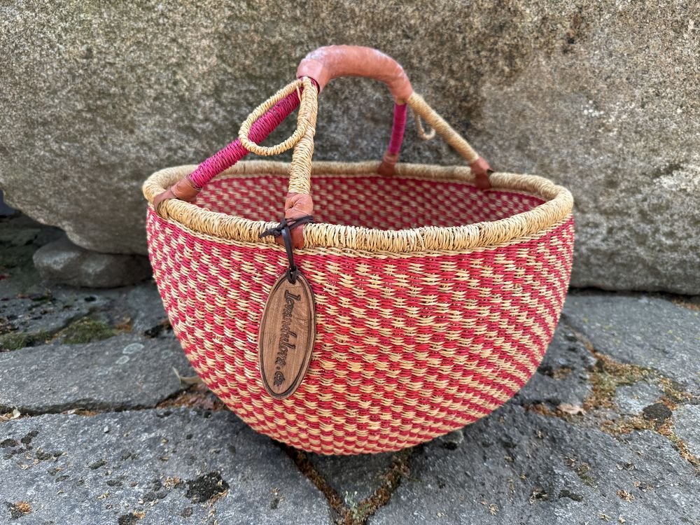 Pevný pletený koš Ghana. Koš je ručně upleten ze sloní trávy a má jedno ucho omotané kůží. Průměr košíku je cca 40 cm. Košky se liší barvou, velikostí i zpracováním. Proto, pokud se Vám líbí právě tento, neváhejte si jej objednat!