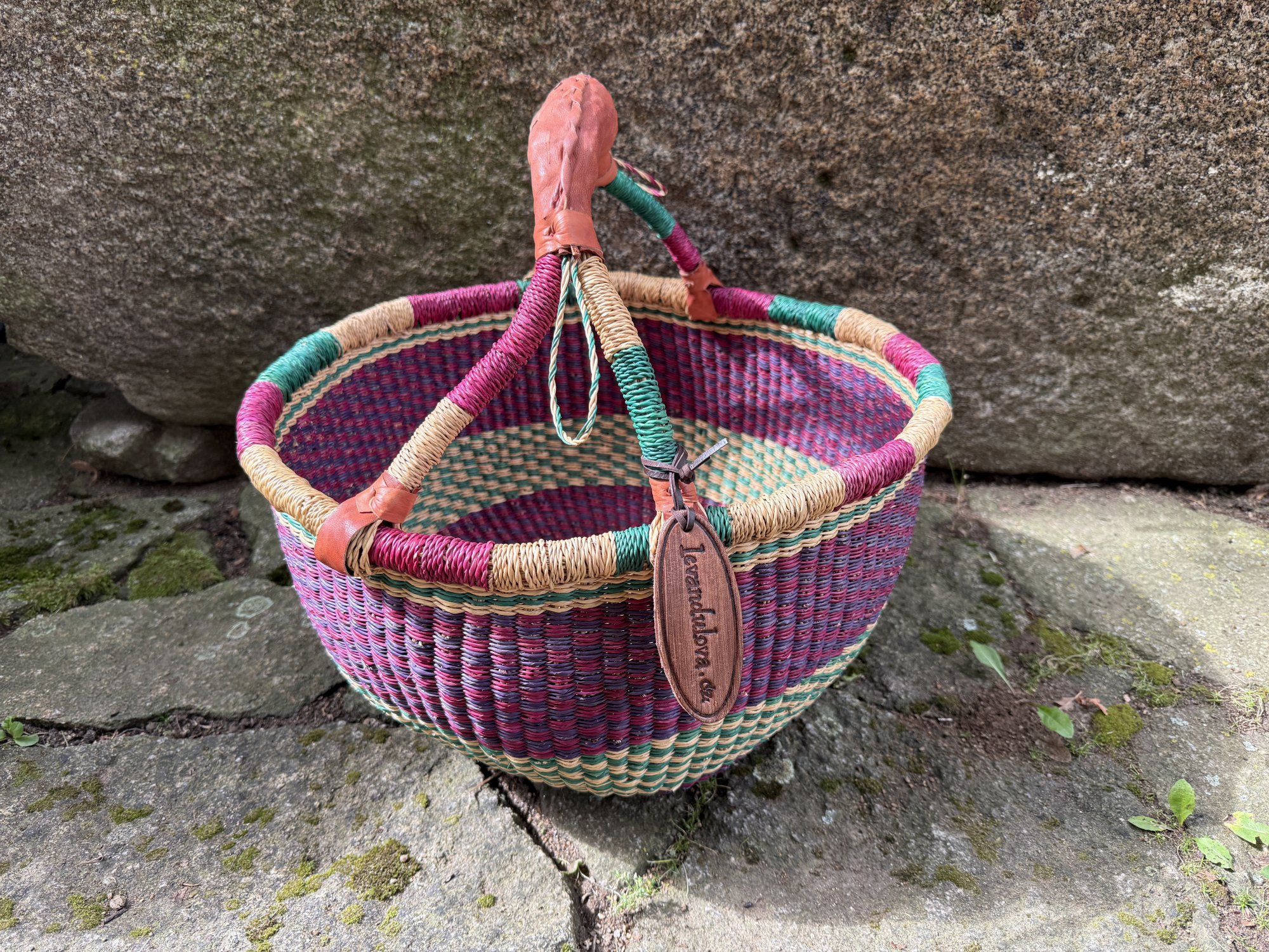 Pevný pletený koš Ghana. Koš je ručně upleten ze sloní trávy a má jedno ucho omotané kůží. Průměr košíku je cca 40 cm. Košky se liší barvou, velikostí i zpracováním. Proto, pokud se Vám líbí právě tento, neváhejte si jej objednat!