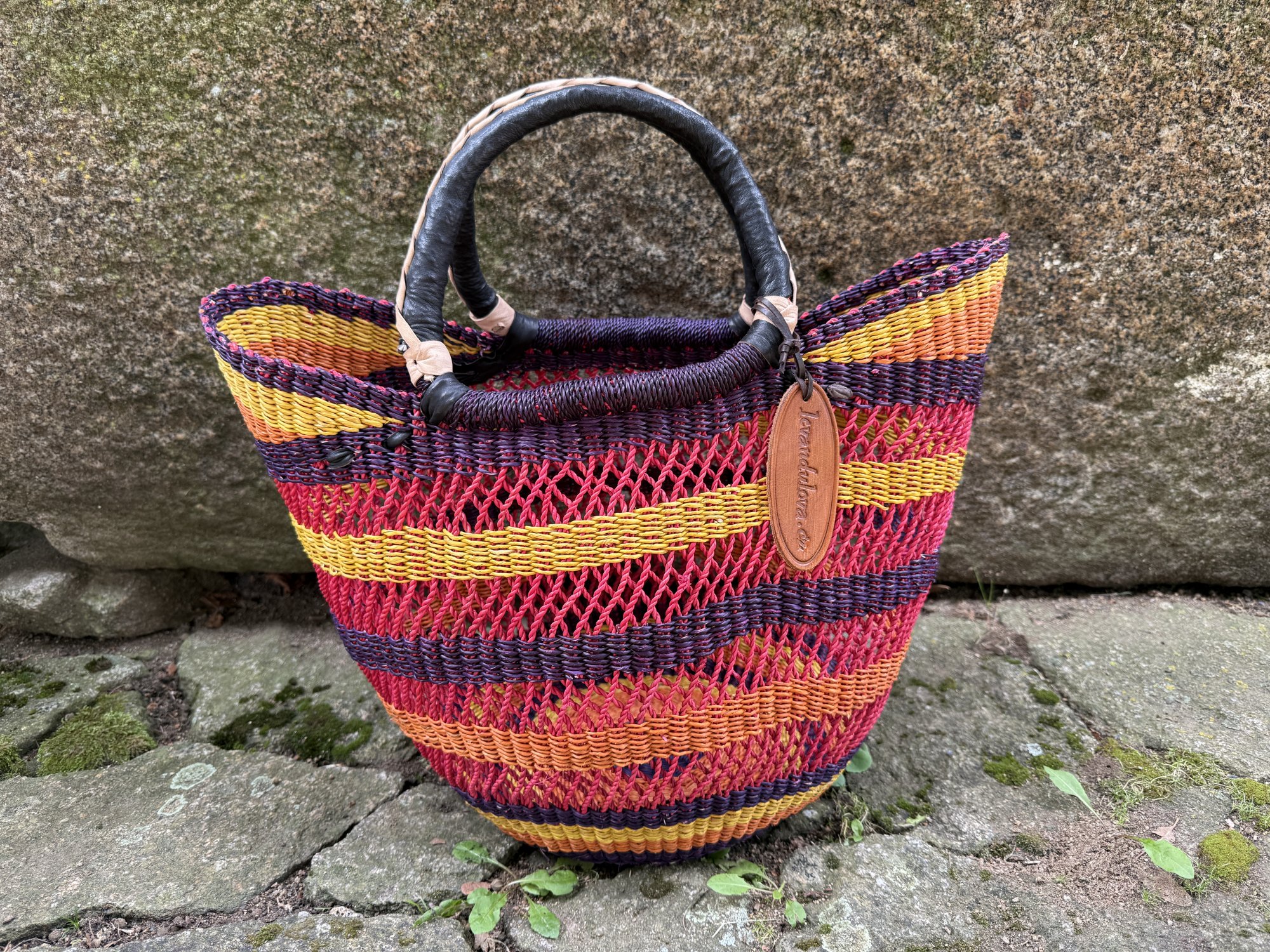 Pevný pletený koš Ghana. Koš je ručně upleten ze sloní trávy a má ucha opletená kůží. Průměr dna je cca 23 cm, výška cca 28 cm a délka horního okraje cca 43 cm. Každý kus je jedinečný a každý je krásný. Liší se barvou, velikostí i zpracováním. Proto, pokud se Vám líbí právě tento, neváhejte si jej objednat!