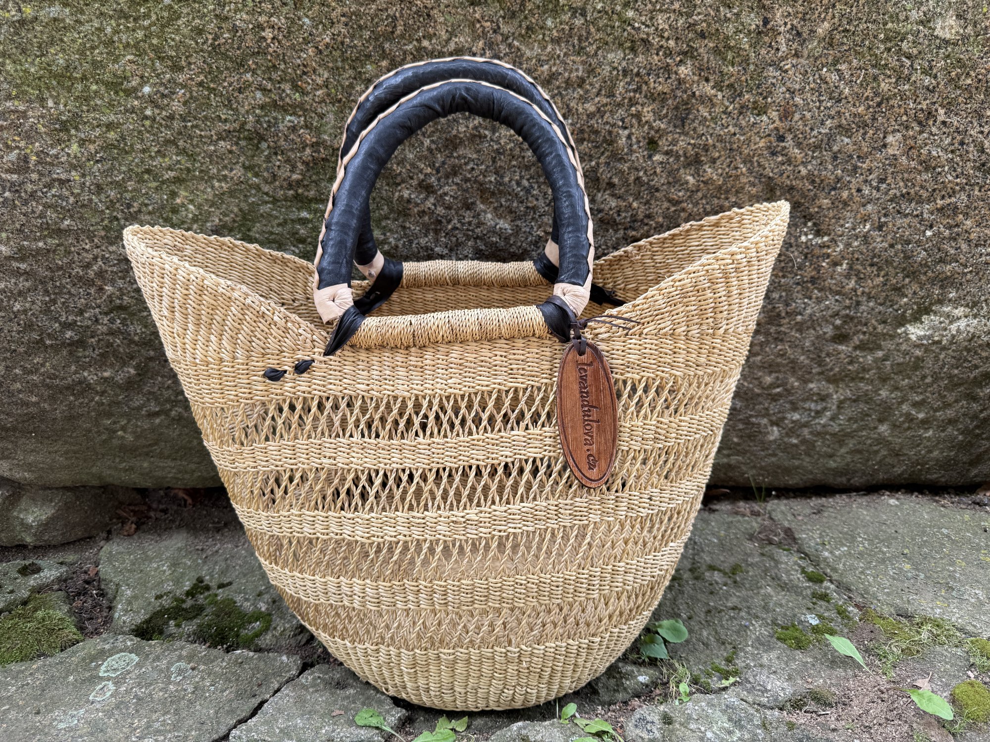 Pevný pletený koš Ghana. Koš je ručně upleten ze sloní trávy a má ucha opletená kůží. Průměr dna je cca 23 cm, výška cca 28 cm a délka horního okraje cca 43 cm. Každý kus je jedinečný a každý je krásný. Liší se barvou, velikostí i zpracováním. Proto, pokud se Vám líbí právě tento, neváhejte si jej objednat!