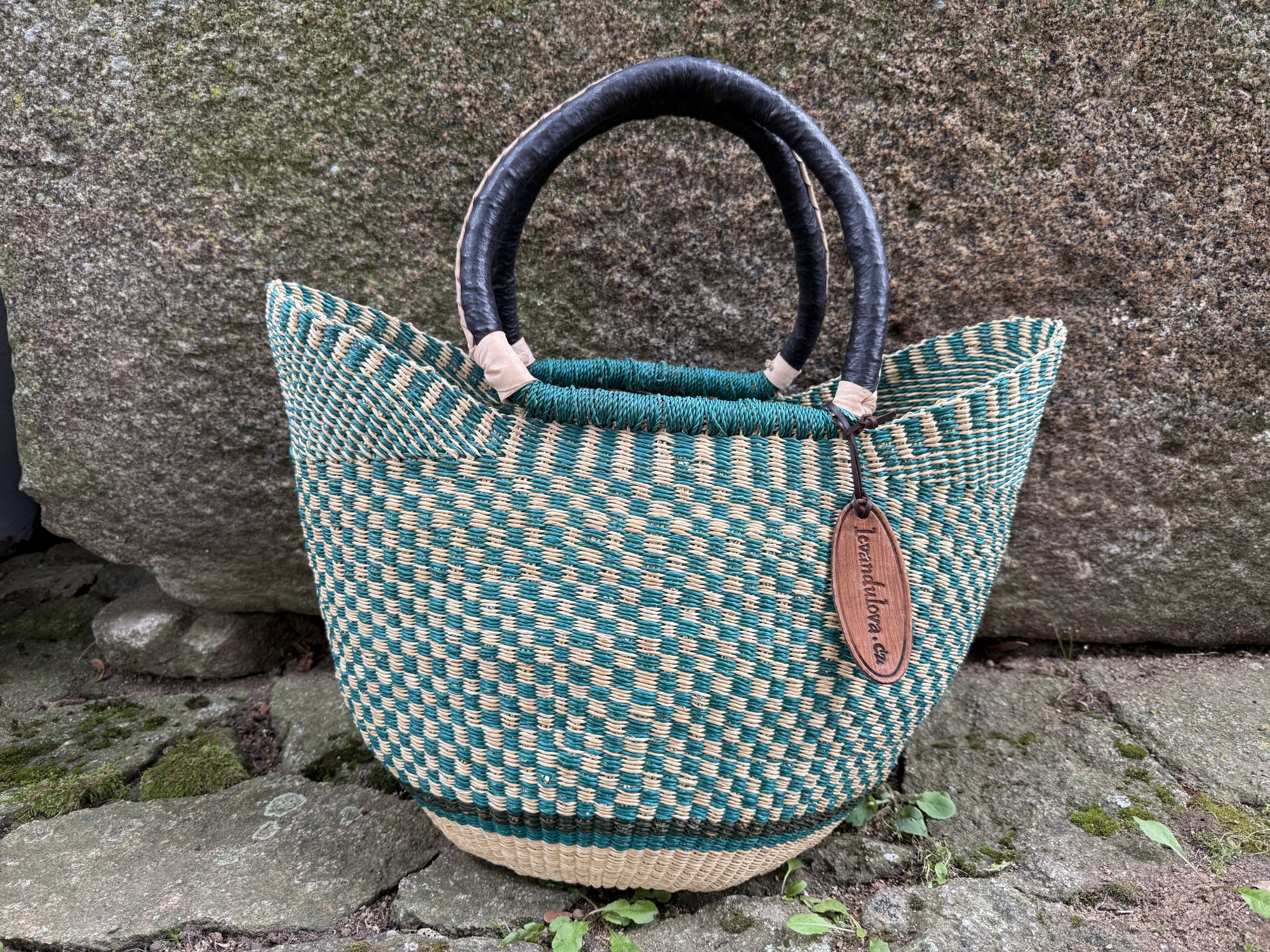 Pevný pletený koš Ghana. Koš je ručně upleten ze sloní trávy a má ucha opletená kůží. Průměr dna je cca 23 cm, výška cca 28 cm a délka horního okraje cca 43 cm. Každý kus je jedinečný a každý je krásný. Liší se barvou, velikostí i zpracováním. Proto, pokud se Vám líbí právě tento, neváhejte si jej objednat!