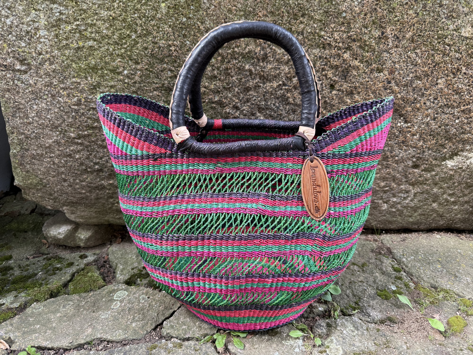 Pevný pletený koš Ghana. Koš je ručně upleten ze sloní trávy a má ucha opletená kůží. Průměr dna je cca 23 cm, výška cca 28 cm a délka horního okraje cca 43 cm. Každý kus je jedinečný a každý je krásný. Liší se barvou, velikostí i zpracováním. Proto, pokud se Vám líbí právě tento, neváhejte si jej objednat!