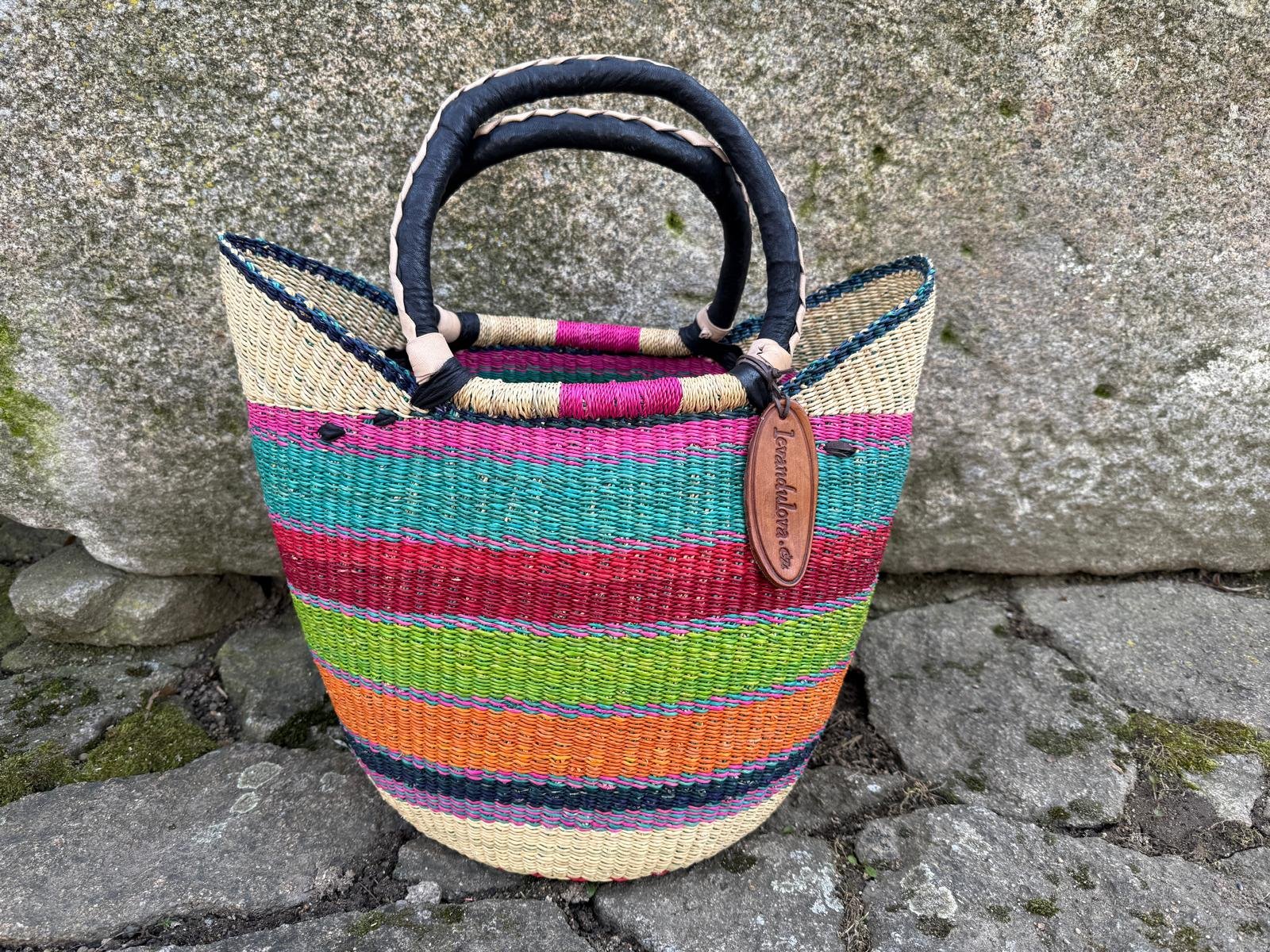 Pevný pletený koš Ghana. Koš je ručně upleten ze sloní trávy a má ucha opletená kůží. Průměr dna je cca 23 cm, výška cca 28 cm a délka horního okraje cca 43 cm. Každý kus je jedinečný a každý je krásný. Liší se barvou, velikostí i zpracováním. Proto, pokud se Vám líbí právě tento, neváhejte si jej objednat!