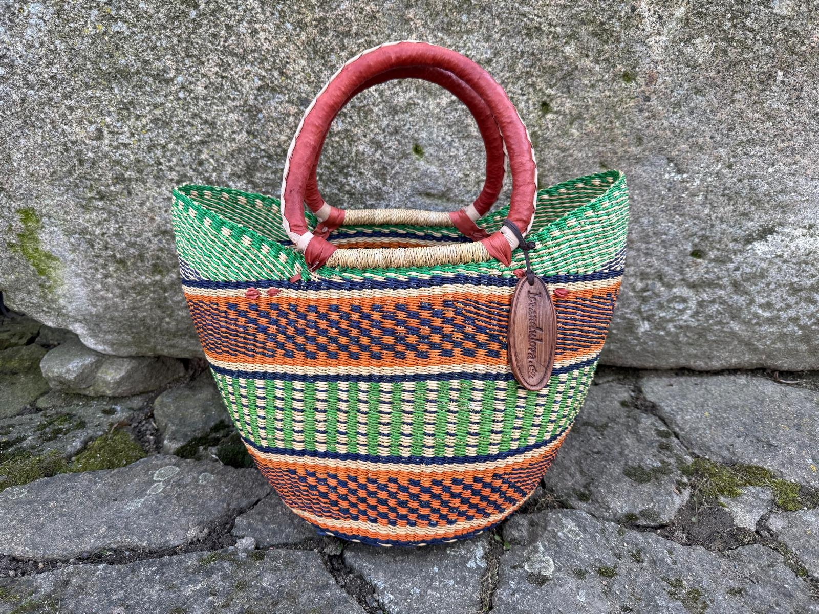 Pevný pletený koš Ghana. Koš je ručně upleten ze sloní trávy a má ucha opletená kůží. Průměr dna je cca 23 cm, výška cca 28 cm a délka horního okraje cca 43 cm. Každý kus je jedinečný a každý je krásný. Liší se barvou, velikostí i zpracováním. Proto, pokud se Vám líbí právě tento, neváhejte si jej objednat!