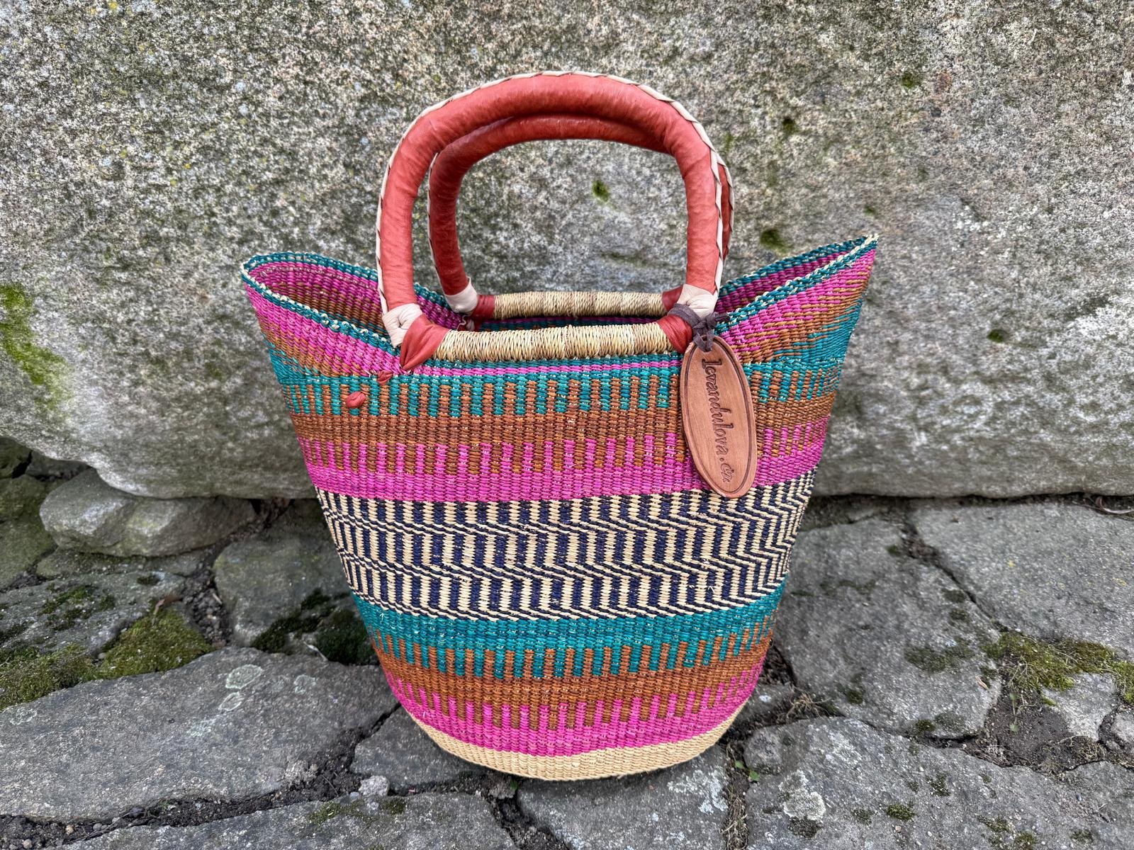 Pevný pletený koš Ghana. Koš je ručně upleten ze sloní trávy a má ucha opletená kůží. Průměr dna je cca 23 cm, výška cca 28 cm a délka horního okraje cca 43 cm. Každý kus je jedinečný a každý je krásný. Liší se barvou, velikostí i zpracováním. Proto, pokud se Vám líbí právě tento, neváhejte si jej objednat!