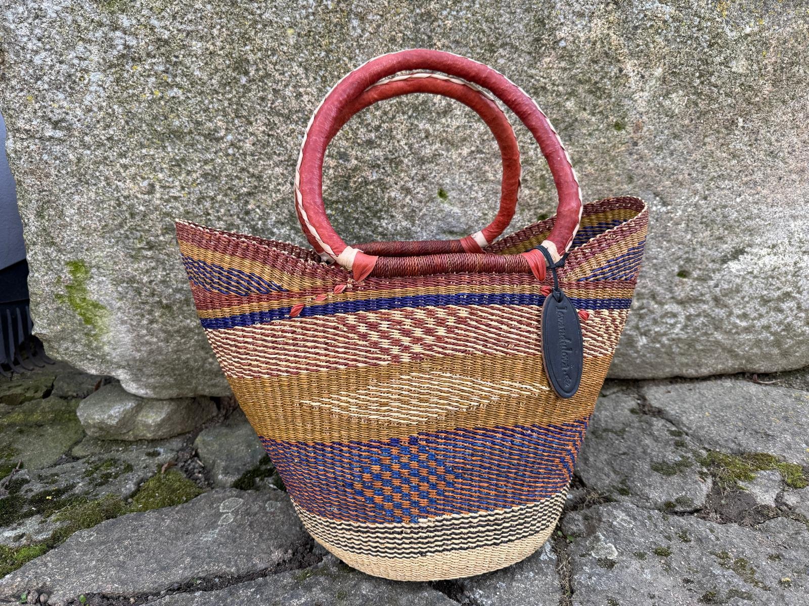 Pevný pletený koš Ghana. Koš je ručně upleten ze sloní trávy a má ucha opletená kůží. Průměr dna je cca 23 cm, výška cca 28 cm a délka horního okraje cca 43 cm. Každý kus je jedinečný a každý je krásný. Liší se barvou, velikostí i zpracováním. Proto, pokud se Vám líbí právě tento, neváhejte si jej objednat!
